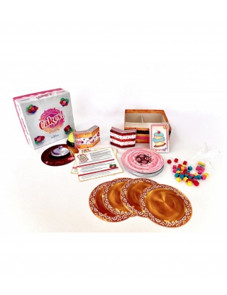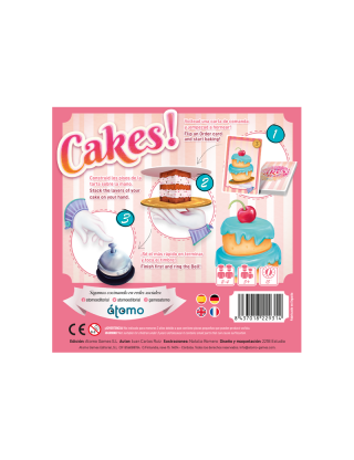 En Cakes juego de mesa, cada jugador recibe una base de plato y cartas de bizcocho. Las cartas de pedido indican qué combinación de pisos deben construir. Cuando alguien cree haber completado su tarta, toca el timbre y todos deben verificar si está bien construida. La mezcla de destreza, rapidez y equilibrio lo hace ideal para todas las edades.